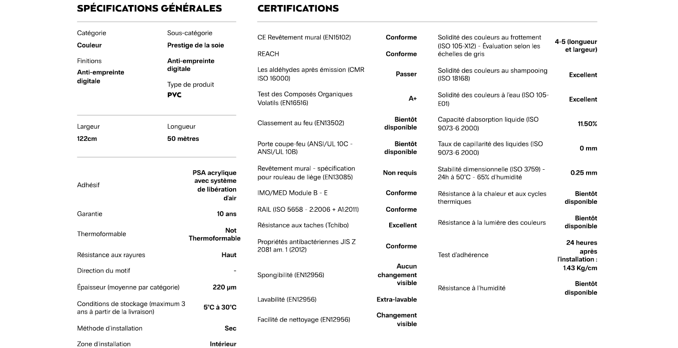 Le produit offre une excellente résistance à l'eau, à la saleté, à l'abrasion, aux rayons UV et à l'usure (jaunissement, craquèlement, écaillage, délamination).
