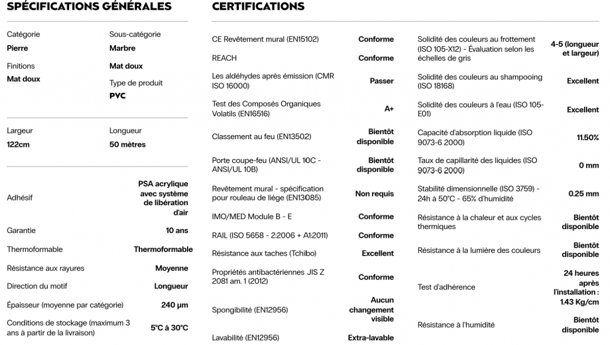 Le produit offre une excellente résistance à l'eau, à la saleté, à l'abrasion, aux rayons UV et à l'usure (jaunissement, craquèlement, écaillage, délamination).